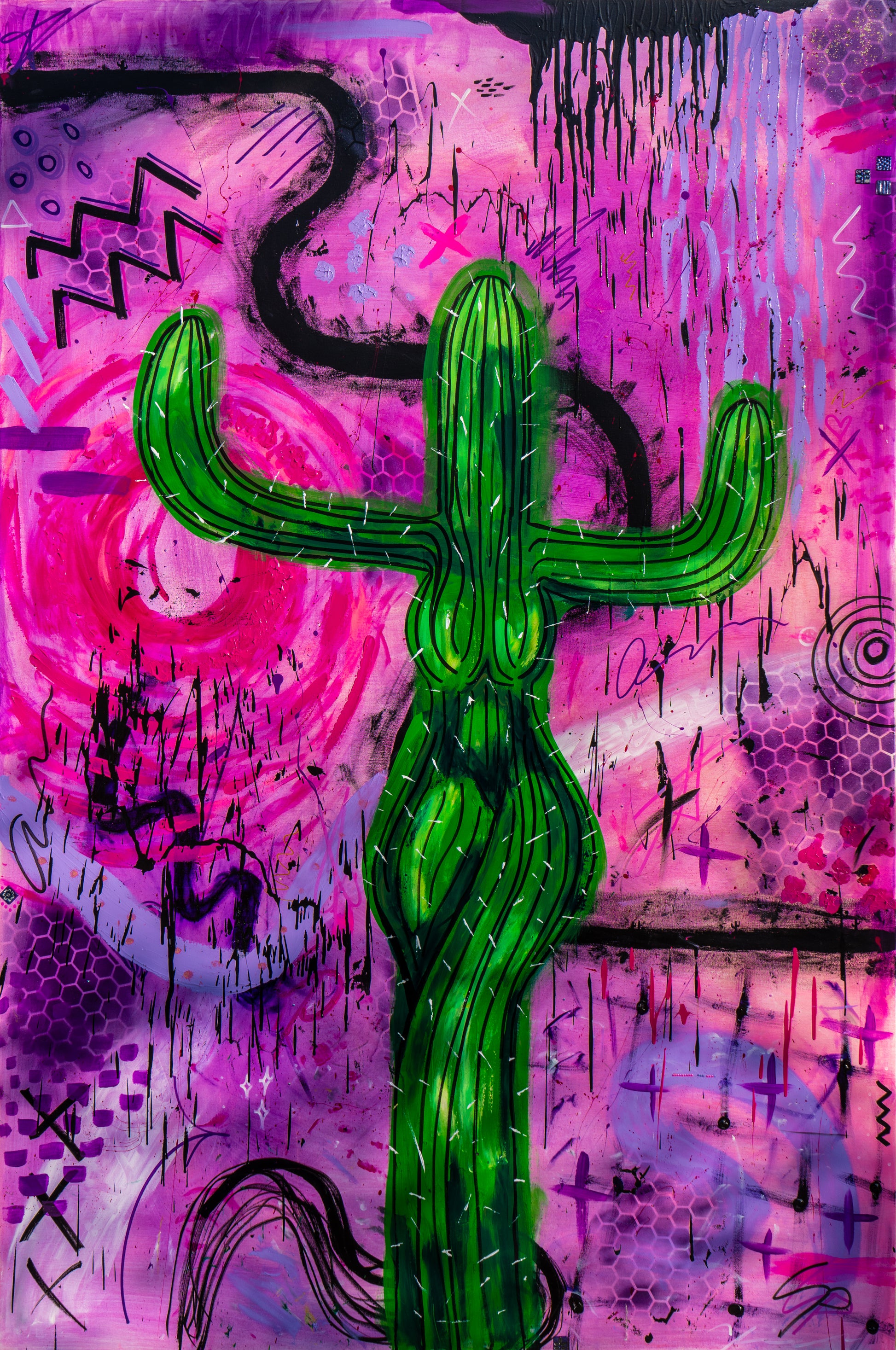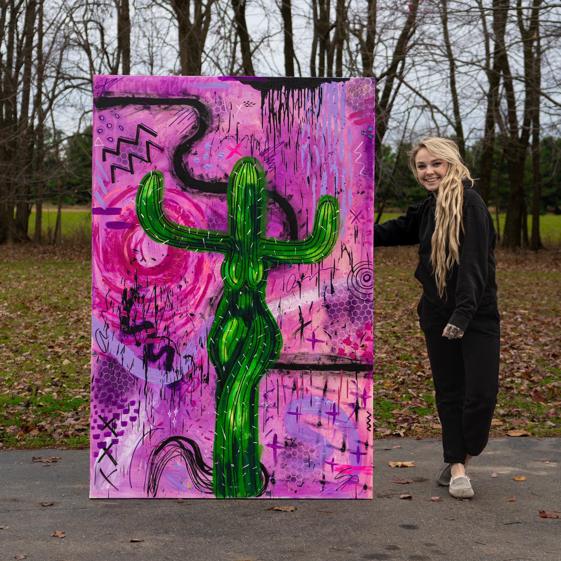 Step into a world of creativity with Desert Muse - a one-of-a-kind, original piece that blends mixed media on canvas. Measuring at 48"x72", this work of art will add a touch of whimsy to any space. Perfect for those who don't take themselves too seriously and appreciate unique, playful pieces.